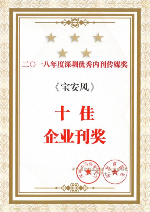 深圳内刊年度综合奖“优秀内刊传媒奖”,由市出版业协会、深圳商报联合组织深圳市新闻出版广电局等资深文化传媒专家评定,每年评选一次,代表着深圳内刊的最高荣誉。《宝安风》在强手林立的深圳内刊界再接再厉,再次获评“深圳优秀内刊传媒奖”之“十佳企业刊奖”。同时,282期“精益人才专题”获“经济专题”三等奖,286期卷首《鲜衣怒马少年时》获评“卷首语”二等奖,283期通讯“宝安三十年 回首皆芳华”获评“好通讯”三等奖。
