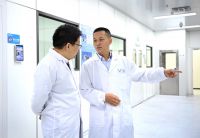 集团总裁陈文昌(右)在贝特瑞中央研究院向黄友元了解研发情况