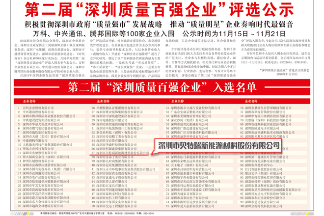 贝特瑞入选第二届“深圳质量百强企业”